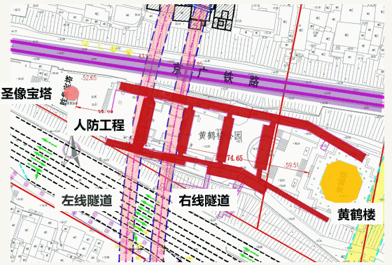 5號線施工風險高。隧道設計拱頂高度與京廣鐵路、蛇山防空洞、“武漢名片”黃鶴樓和元代“圣像寶塔”距離分別為26米、4.2米、86.9米和50米。爆炸產生的沖擊波振動,成為施工關鍵重難點。
