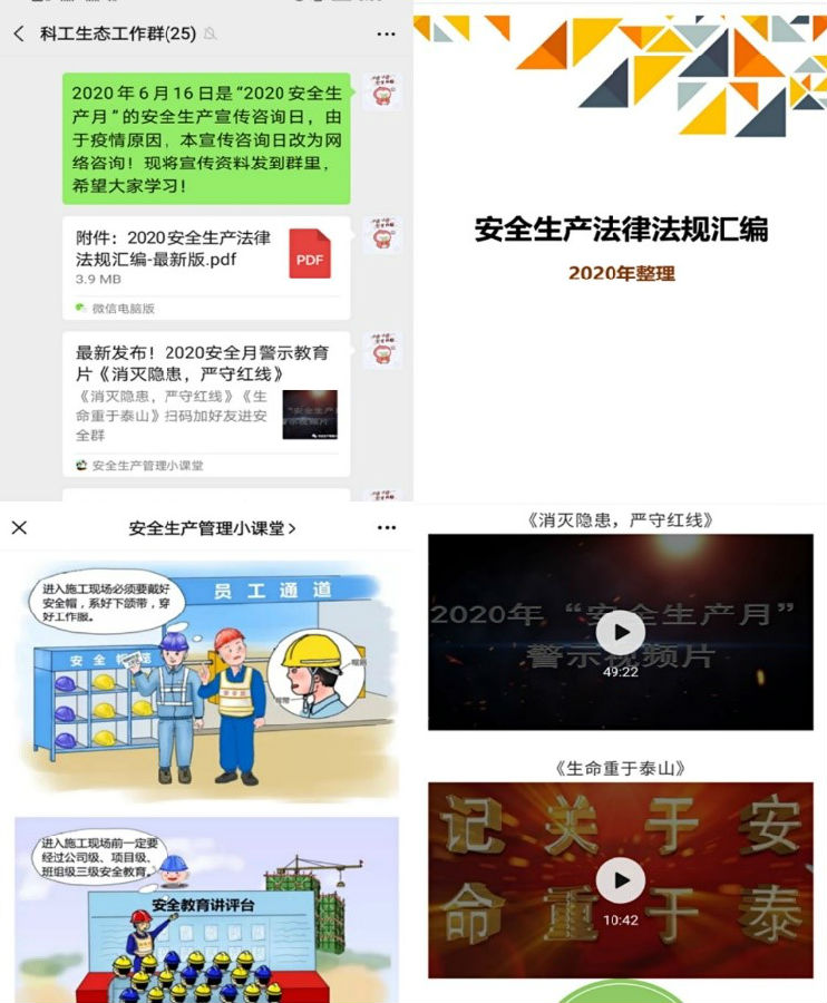 科工生態克服疫情不利影響,利用微信工作群、公眾號、大講堂等多種線上形式組織員工學習安全生產法律法規、觀看警示教育片,并利用生動有趣的插畫圖片,組織員工深入學習安全生產知識,營造出濃厚的學習氛圍。
