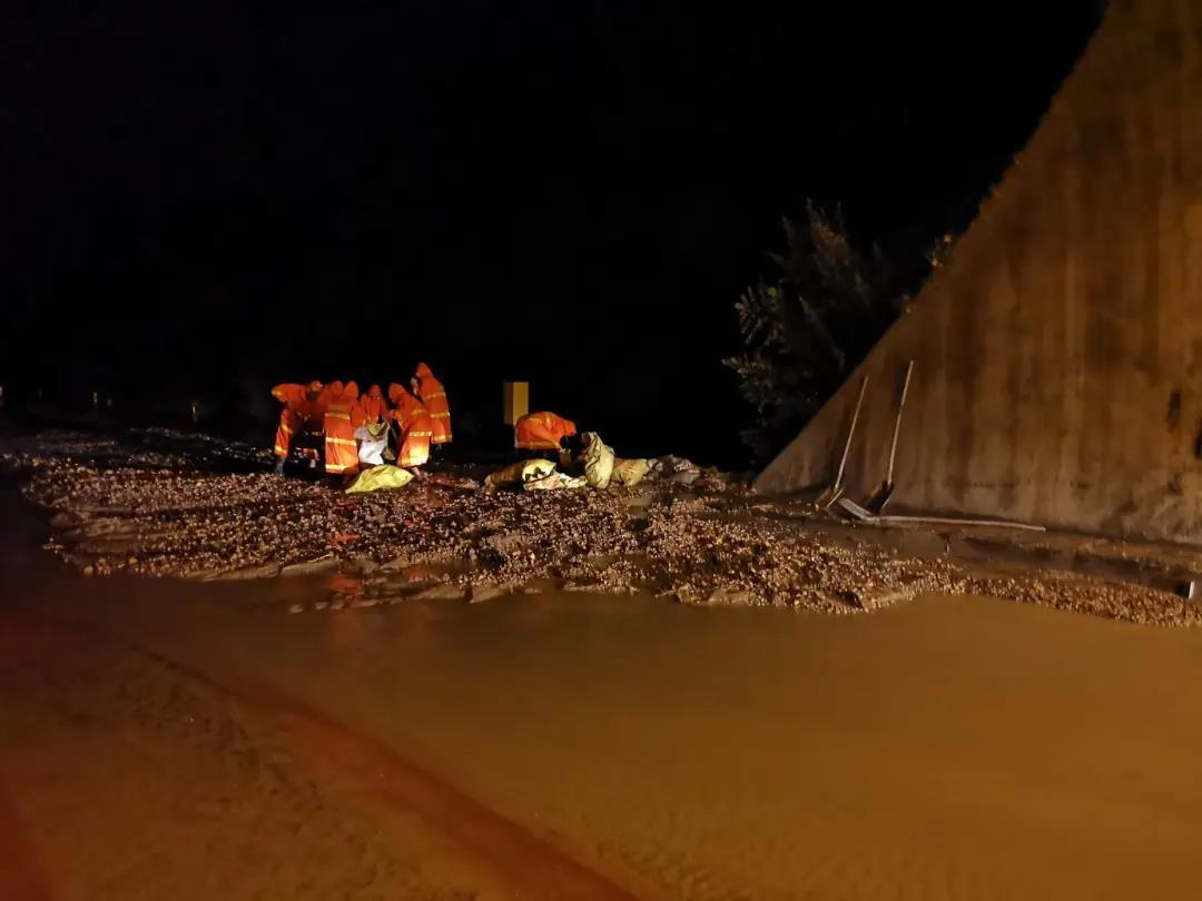 受近期強降雨影響,中交四公局負責運營的銅永高速公路永川段出現洪澇災害,玉龍山隧道洞頂截水溝出現山澗大面積積水,淤積物阻塞高速公路。中交四公局銅永項目公司立即啟動應急預案,趕赴事故現場緊急搶險,設立醒目的交通標牌,維護交通秩序,保障道路安全暢通。