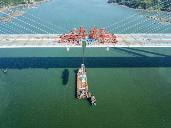 沙埕灣跨海大橋全長2054米,采用雙向6車道,設計時速100公里。大橋為主跨535米雙塔雙索面單側不對稱混合梁斜拉橋,采用“一跨過江”,避免了對沙埕灣海域的干擾,同時突出了海島景觀。大橋主橋鋼箱梁為封閉扁平流線形鋼箱梁,縱橋向共57個梁段,包含主橋邊跨22段和主橋跨中35段,單片梁段最大重量約320噸。此次合龍梁段寬40.5米,長4米,重81.3噸,由2臺225噸橋面吊機抬吊至設計橋面,經線性調整、打磨、焊接等工序,與既有鋼箱梁焊接成整體,實現南北貫通。