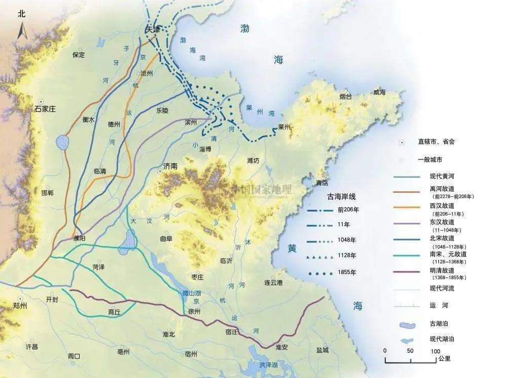 黃河變遷史上的六次大改道。據記載,自公元前602年至1938年的2540年中,黃河下游總計決溢1590多次。波及范圍北達天津,南抵蘇皖,包括今天的黃淮海平原,縱橫25萬平方公里。