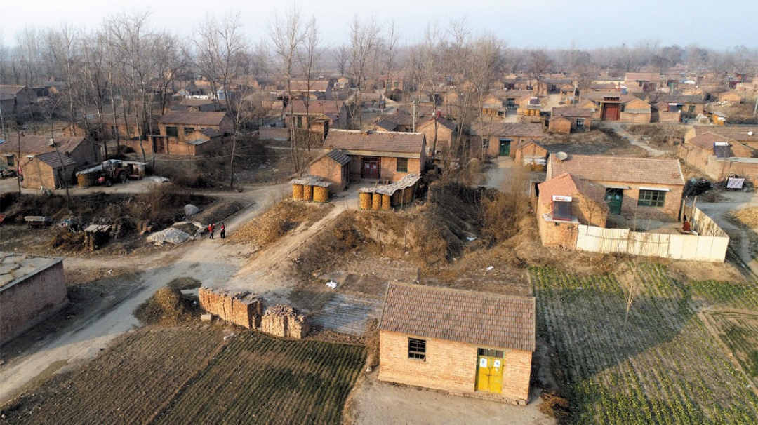 俯瞰鄄城縣三合村舊村落和新村臺,遠處蜿蜒的飄帶就是黃河。