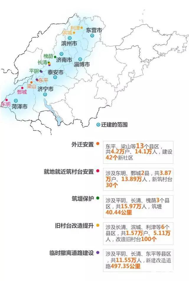 新中國成立后,黃河灘區陸續實施了就地就近筑村臺遷建、外遷安置、防洪撤離道路建設等工程。2015年,通過兩期黃河灘區居民遷建試點,外遷安置東平、鄄城等4個縣1.3萬人。