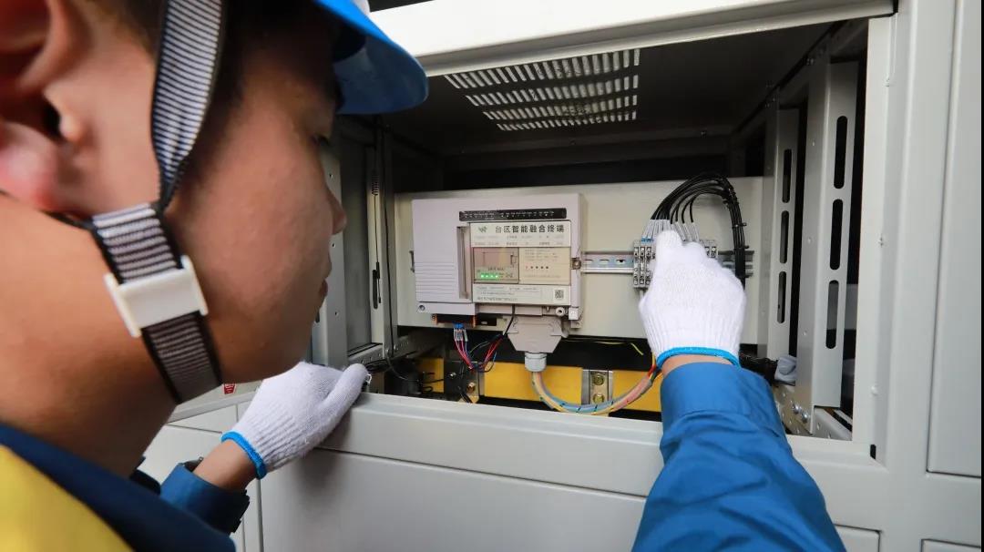 供電公司工作人員安裝調試箱變智能檢測終端。