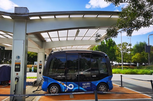百度APOLLO無人駕駛汽車在光儲充一體化車棚充電。
