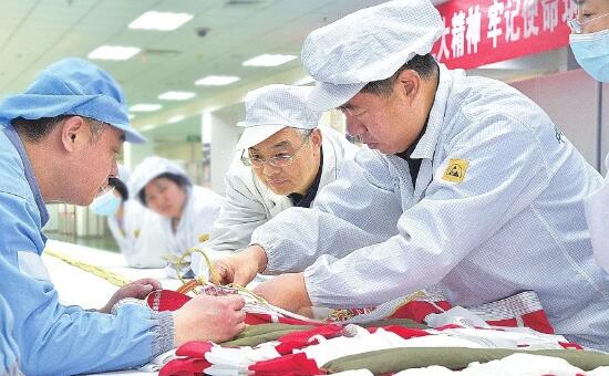 研制人員正在進行神舟十二號飛船正樣飛行減速傘包傘關鍵工序收口繩安裝工作