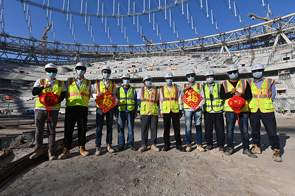 當地時間2月13日,農歷正月初二,在距地面約66米的高空,中國鐵建國際集團承建的2022年卡塔爾世界杯主體育場盧賽爾體育場項目總重量約2300噸的主索網張拉成形,與鋼結構成功銷接,標志著中國企業首次以設計施工總承包身份參建的世界杯主場館屋面主體結構順利完工。
