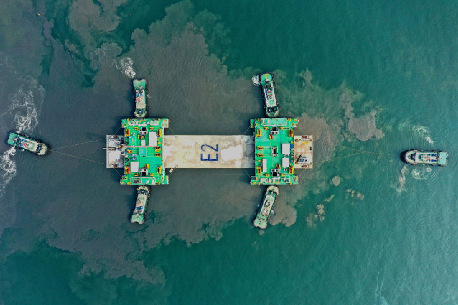 此次安裝的E2管節為標準管節,長180米、寬33.4米、高9.7米、重約6萬噸,與2020年12月9日已安裝的E1非標準管節相比,E2管節長度更長,重量更大,水箱配載更多,浮運安裝難度也更高。