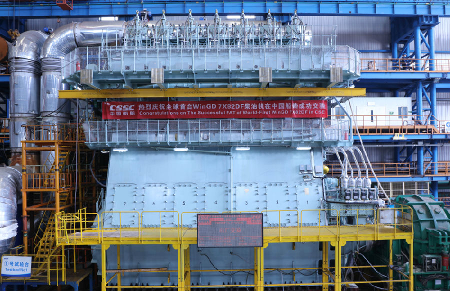 4月28日,全球首臺WinGD 7X82DF型雙燃料主機在中國船舶集團有限公司旗下中國船舶重工集團柴油機有限公司(以下簡稱中國船柴)成功交驗。該主機最大持續功率2.25萬千瓦,重達928噸,滿足國際海事組織TierⅢ排放標準,將安裝在大連船舶重工集團有限公司為中遠海運能源運輸有限公司建造的31.8萬噸油輪上。