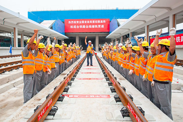 6月22日上午,在浙江省臺州市溫嶺市杭(州)紹(興)臺(州)鐵路終點溫嶺站施工現場,隨著中國鐵建中鐵十一局集團施工人員將最后一對長鋼軌順利鋪設到接軌點,精準落位,標志著我國首條民營控股的高鐵——杭紹臺鐵路全線鋪軌貫通,為年底全線開通運營奠定了堅實基礎。