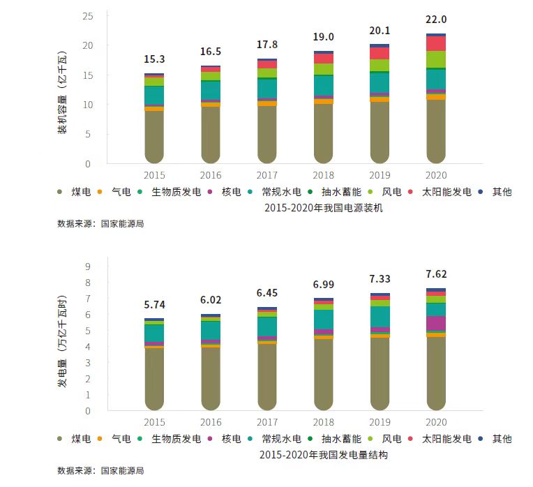 《中國電力發展報告2020》指出,“十三五”期間,我國電力裝機結構持續優化,電力工業綠色低碳轉型成效顯著。截至2020年底,非化石能源消費比重達到15.9%,超額完成“十三五”規劃目標;非化石能源裝機達到9.8億千瓦,占全國發電總裝機的45%;水電(含抽蓄)裝機達到3.7億千瓦;風電、太陽能合計裝機達5.3億千瓦,生物質發電裝機超過2700萬千瓦,均超額完成“十三五”規劃目標。