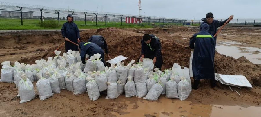 民航機場建設集團所屬民航建工參建的鄭州新鄭國際機場三期擴建工程項目和鄭州湖畔云廬項目第一時間成立防汛應急工作小組,召開會議進行防汛部署。在機場三期擴建工程飛行區,組織現場人員冒雨在飛行區圍界附近進行防汛搶險,灌裝防汛沙袋,修復飛行區附近破損道面和坍塌溝槽。在湖畔云廬項目部,組織工作人員架設水泵、鋪設水管、裝填防汛沙袋,對存在隱患的部位進行緊急處理。