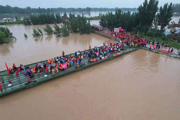 7月22日晚,中國安能的專業救援人員102名,攜應急動力舟橋、全地形兩棲救援車等裝備30臺套,奔赴河南新鄉市衛輝市頓坊店鄉牛場村,連夜搭設應急動力舟橋。