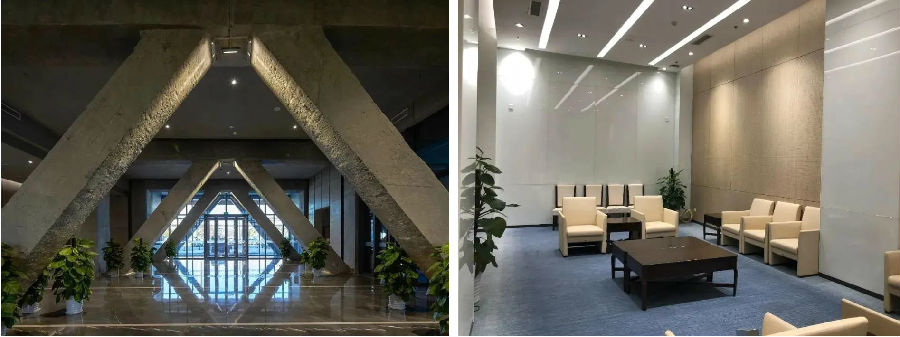 項目團隊在保留原有結構和框架的基礎上,通過使用碳纖維、鋼板和阻尼抗震撐等手段對原有主體結構加固以適應新的功能需求,在材料上使用石英板面層作為幕墻主要材料,內裝區域選用穿孔吸音的木飾面板,保障隔音和美觀需求,達到綠色建筑星級標準,充分彰顯“綠色辦奧”理念。