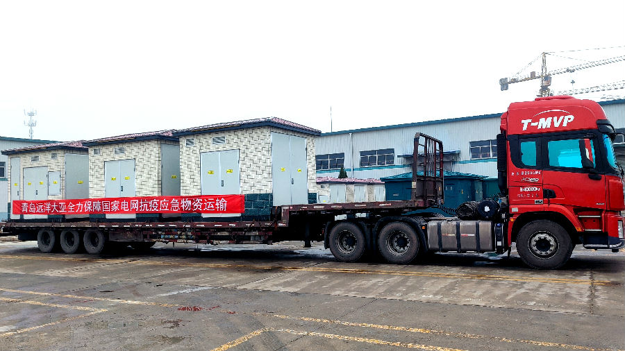 此外,根據國家電網在山東省內緊急調撥大型箱變的需求,遠洋大亞在3月12日早上8點接到緊急任務后,小組快速進入工作狀態,歷經48小時,順利將煙臺與淄博兩地的大型箱變運抵德州德城、臨邑等地,保障了抗疫電力基建的順利開展。