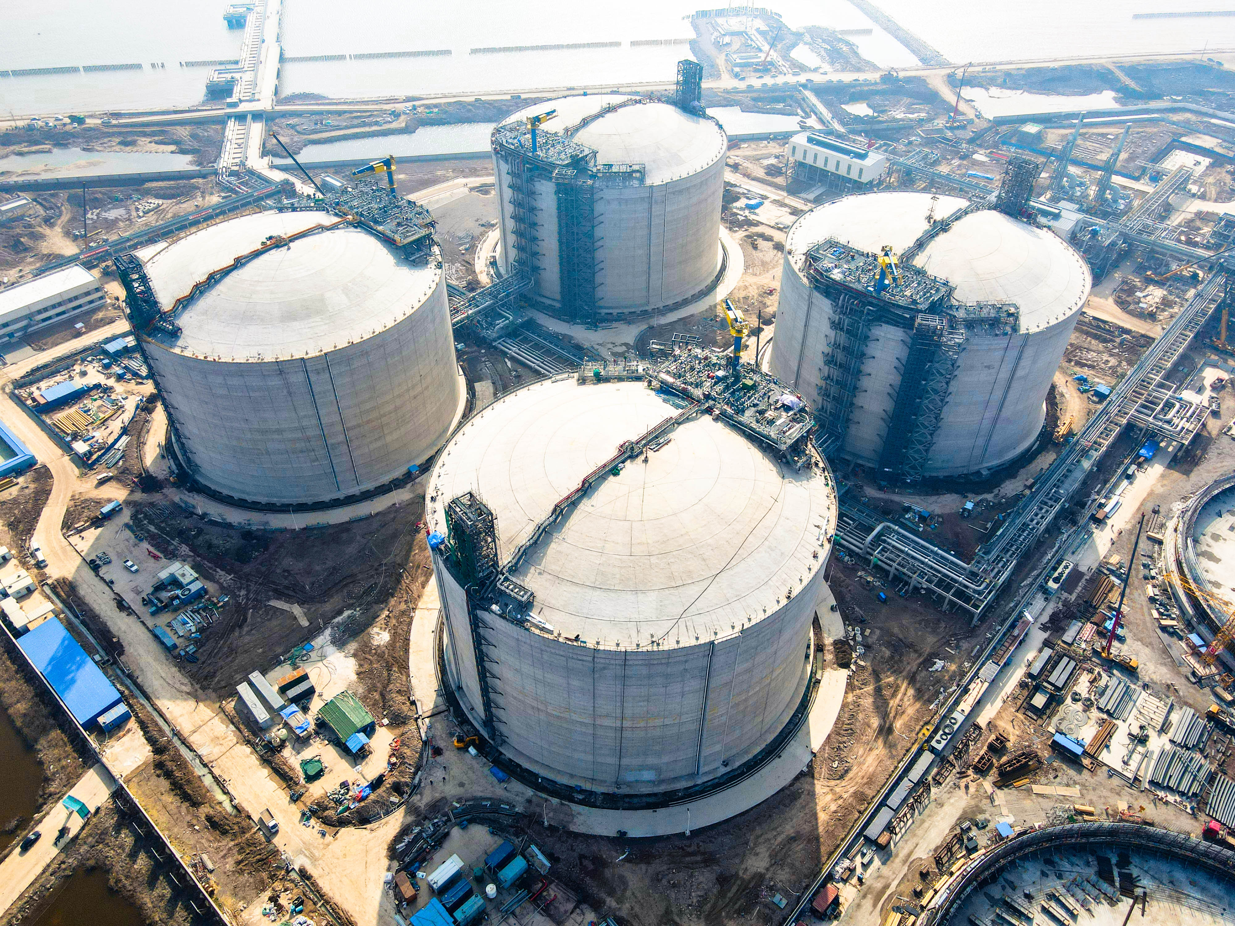 3月25日,由我國自主設計建造的4座22萬方LNG儲罐施工完成。