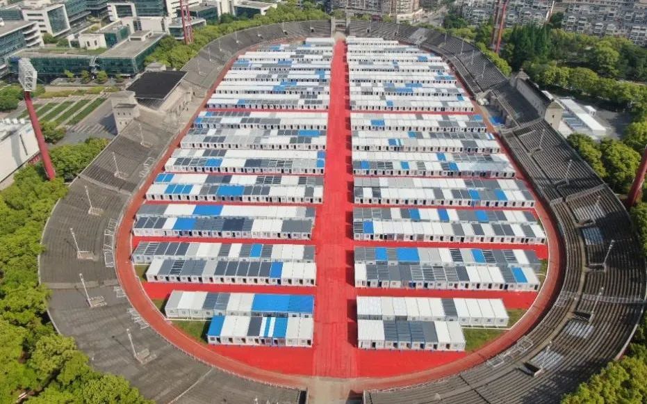 5月2日深夜,中交援建的上海首個大型隔離點—楊浦江灣體育場隔離點歷經5天5夜鏖戰后順利完成竣工交付,為抗疫提供隔離用房1100間、床位1800張。