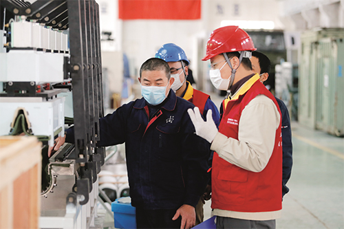 國網浙江電力共產黨員服務隊上門幫助企業檢查用電設備。