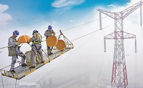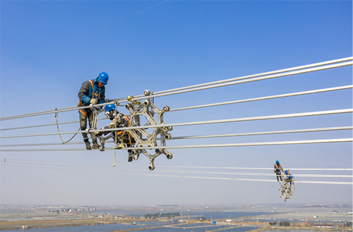 國網江蘇電力員工在±800千伏白鶴灘—江蘇特高壓直流輸電工程線路上安裝間隔棒。