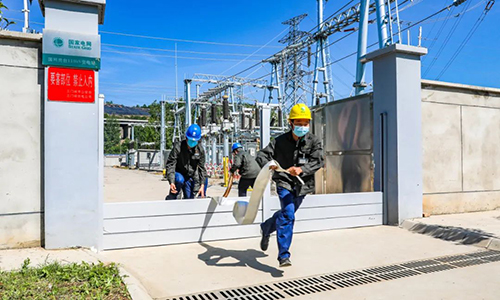 國網河南電力組織開展防汛演練,為變電站鋪設排水管道。
