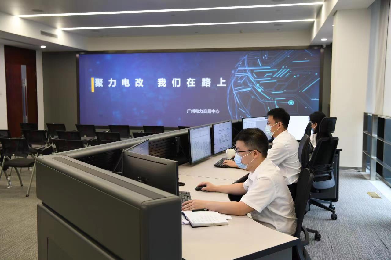 在廣州電力交易中心交易大廳,工作人員在進行電力交易操作。