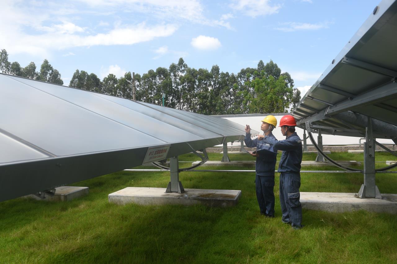 南方電網廣東廣州供電局工作人員在進行南沙“多位一體”微能源網示范工程太陽能集熱系統巡檢工作