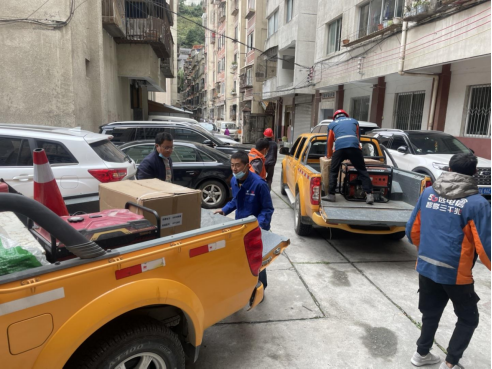 中國電信準備發電機等搶險物資,裝車出發前往瀘定磨西搶險