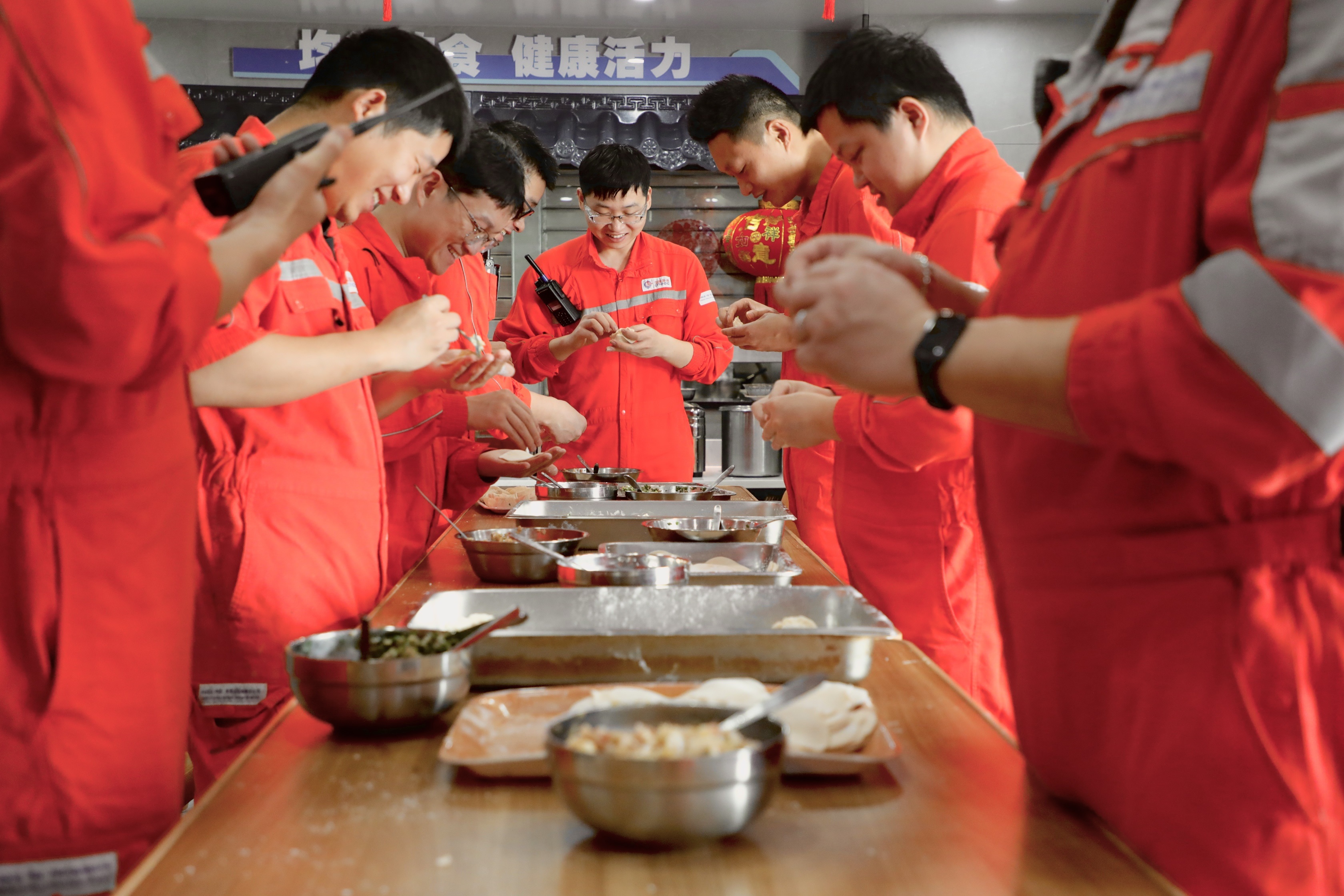1月23日,農歷正月初二,“深海一號”超深水大氣田員工在包餃子迎新春。