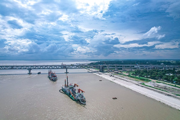 帕德瑪河年徑流量達13100億立方米,被稱為“世界上最險惡和不可預測”的河流之一,常年攜帶大量泥沙,每年枯水期到洪水期,水位漲幅超過5米,表面流速超過4米每秒,洪水期大部分河床沖刷深度達45米以上,枯水期又會全部回淤。項目的建成,確保了孟國人民的“夢想之橋”——帕德瑪大橋安全無虞,并護佑兩岸民生安瀾,是大橋百年通暢、福祉兩岸的鎮河基石,極大促進了孟加拉國及南亞區域互聯互通和經濟發展。