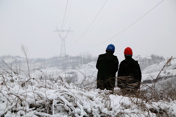 國網河南洛陽供電公司員工冒雪特巡220千伏福欒線。