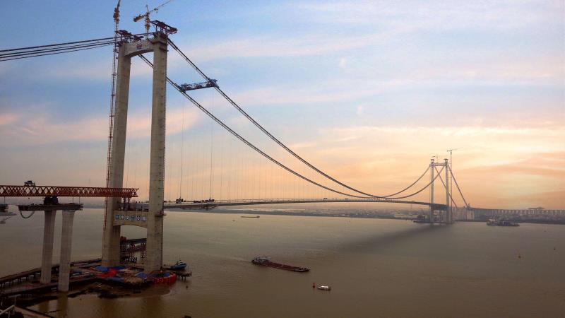 世界最寬鋼箱梁懸索橋虎門二橋大沙水道橋成功合龍
