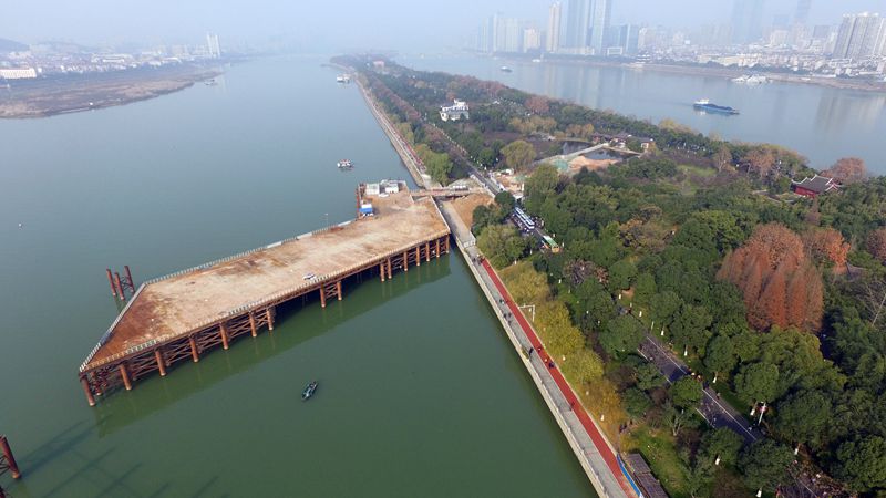 項目部成立科技攻關小組,與中南大學、山東大學聯合,開展施工研究與科技攻關。聘請國內知名專家對盾構穿越巖溶發育地段風險進行充分論證,最終確定了水上鋼平臺施工方案。中南大學教授、湖南省巖石力學與工程學會副理事長陽軍生表示,“江面搭設固定平臺直接處理,溶洞處理施工周期短,汛期影響小,對行洪影響小,施工風險低。”項目部通過搭建近六千平方米的施工平臺,將溶洞處理由水上施工化為“陸地”施工等系列方案,有效解決了淺溶洞區鋼管樁打設的技術難題。