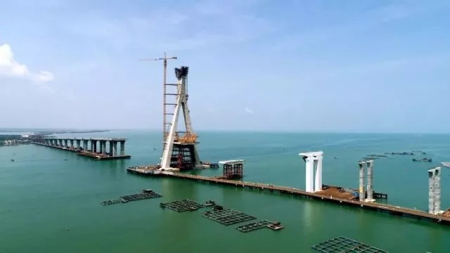4月8日,國內首個跨斷裂帶大橋——海南鋪前跨海大橋主塔封頂,標志著主橋整體邁入上構施工快通道,也為大橋按期貫通奠定了基礎。