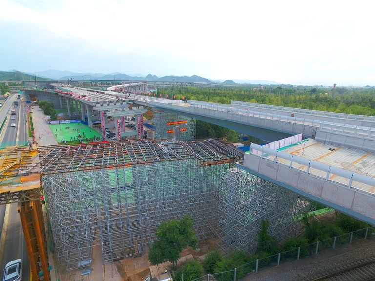 京包鐵路是國內重要的鐵路主干線之一,客運列車多,行車密度大,所有施工必須在保障鐵路正常運輸的前提下進行。為確保施工安全,在轉體過程中,中鐵十九局全程采用計算機程序控制,實時比對,準確控制轉體角度,不給鐵路既有線運營和公路行車帶來安全隱患。