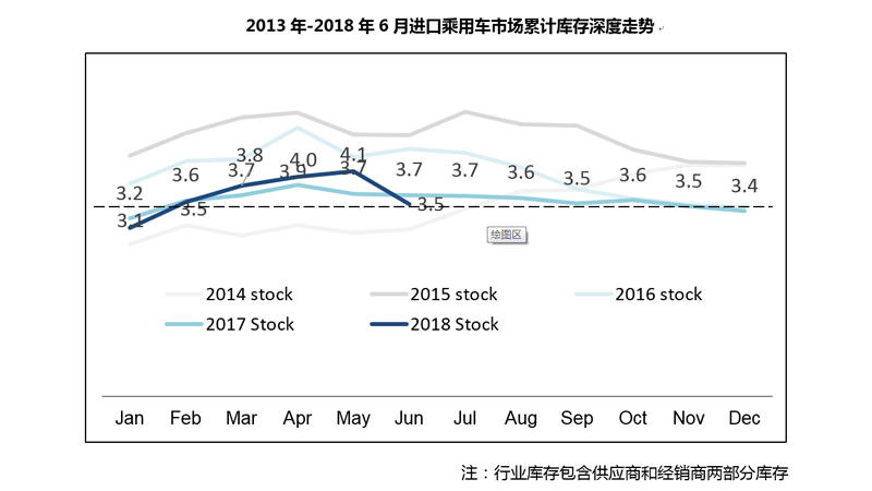 從庫存方面看,受關稅政策影響行業庫存絕對量和庫存深度波動較大,2018年6月行業庫存[供應商庫存+經銷商庫存]深度為3.5個月,相比2017年3月的3.7個月,下降0.2個月。根據中國汽車流通協會的經銷商庫存調研顯示,2018年6月進口經銷商庫存為1.83個月,高于經銷商庫存水平線1.5個月的合理庫存。