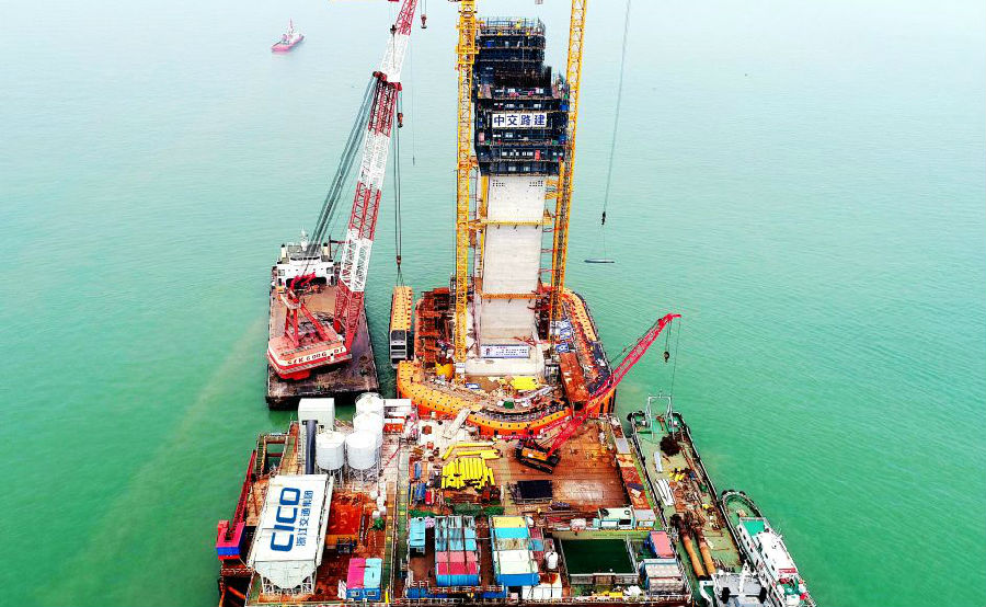 在茫茫東海上,如何克服深水海域施工面臨的潮汐、暴雨、夏秋臺風、冬季季風等不利自然因素影響,如何將10萬噸級防撞“黃金甲”安全運送、安裝到位,如何防控安全質量風險、提高施工效率,成為擺在大橋建設者面前的重大難題。施工過程中,項目團隊一方面組織力量加快技術攻關,不斷優化施工方案,充分發揮“機械化”“模塊化”作業優勢,全程應用BIM技術,提升項目的信息化、精細化、集約化管理水平。一方面發揚工匠精神,精心控制細節,內層防撞鋼套箱采用組合模塊車滾裝上船、2600噸浮吊整體下放,用時6小時完成運輸、起吊、安裝工作,通過精調限位一體化裝置,將防撞鋼套箱最大平面偏差控制在1.5厘米以內;外層防撞鋼套箱由350噸浮吊分塊起吊安裝,精度實現“零誤差”。