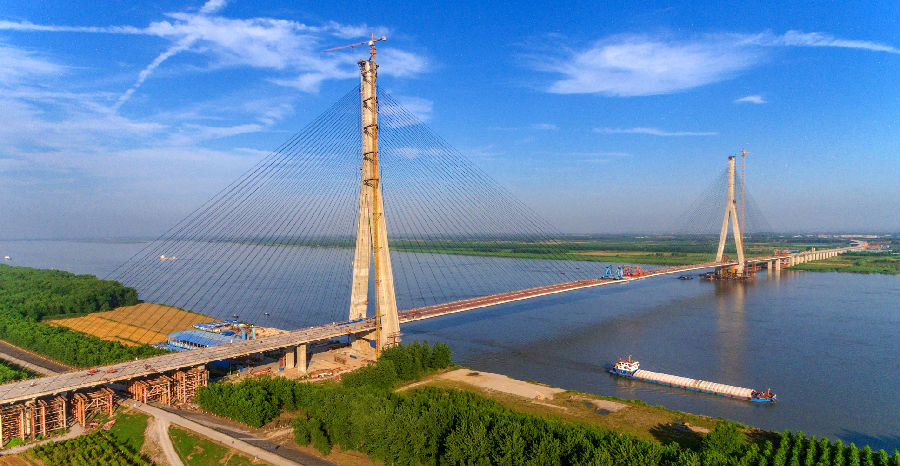 跨徑世界第七、單側非對稱混合梁斜拉橋世界第一——湖北嘉魚長江公路大橋主橋合龍,預計年底通車。大橋主橋長1650米,塔高239.5米。項目建成后,將結束“千橋之鄉”湖北咸寧市200公里長江沿岸無大橋的缺憾,讓武漢城市圈環線高速成環,更好地融入長江經濟帶發展。