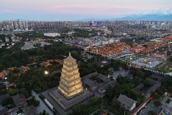 圖為盛夏時節日暮時分的西安大雁塔與大唐不夜城景區,吸引眾多游人前來一覽勝景。(記者 邵瑞 攝)
