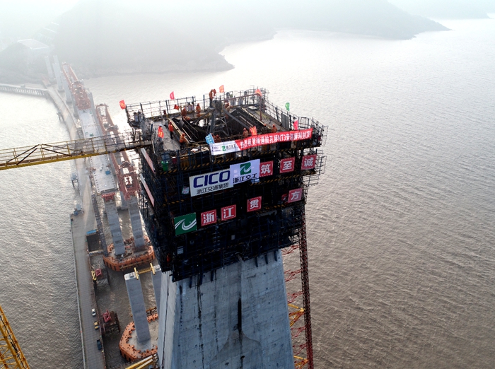 近日,寧波舟山港主通道舟岱跨海大橋南通航孔橋NT3主塔順利封頂。 NT3塔柱完美呈現“鉆石”頂,至此,舟岱跨海大橋五個主塔施工全部完成,標志著舟岱跨海大橋工程取得關鍵性進展,為大橋早日建成通車奠定了堅實基礎。