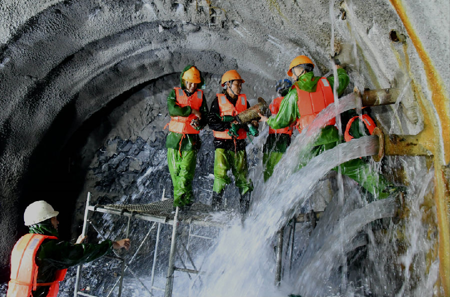 大柱山隧道全長14484米、是穿越全世界最復雜險峻的山系——青藏高原橫斷山脈的第一條鐵路,大柱山隧道位于大瑞鐵路大理至保山段保山市境內,穿越瀾滄江深大斷裂與保山褶皺帶交界處,穿過含斷層破碎帶、侵入體蝕變帶、巖溶等不良地質和重大風險,被稱為是“最難掘進鐵路隧道”。建設者猶如在豆腐渣里打洞,同時還要承受“水深”“火熱”的考驗。隧道自2008年開工以來,建設者穿越6條地質斷裂帶,為排出單日最高22萬立方米的涌水,先后建設7座抽水站,56臺大水泵接力,這樣的單日涌水量,足足可以蓄滿88個長50米的標準游泳池。隧道內高地溫段長期溫度達40℃左右、濕度85%以上,施工單位長年往隧道施工挖掘面運送冰塊降溫,每天每個挖掘面需要12噸冰塊,施工人員每3小時就要輪換一次。
