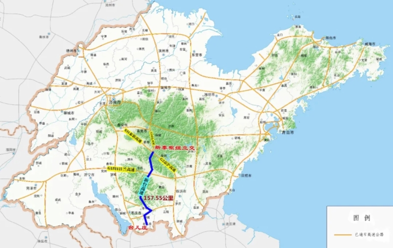 新臺高速是山東省“九縱五橫一環七射多連”高速公路網中“縱五”線的重要組成部分。項目全長157.548公里,概算總投資154.5億元,雙向四車道,設計速度120公里/小時,全線共有8座隧道,是目前山東省內在建高速公路項目中規模最大的隧道群。