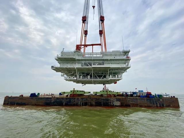 近日,在杭州灣浙江省能源集團嘉興1號(以下簡稱嘉興1號)海上風電場的海面上,嘉興1號海上風電場海上升壓站的上部組塊——重達3000噸的“巨無霸”吊裝就位。