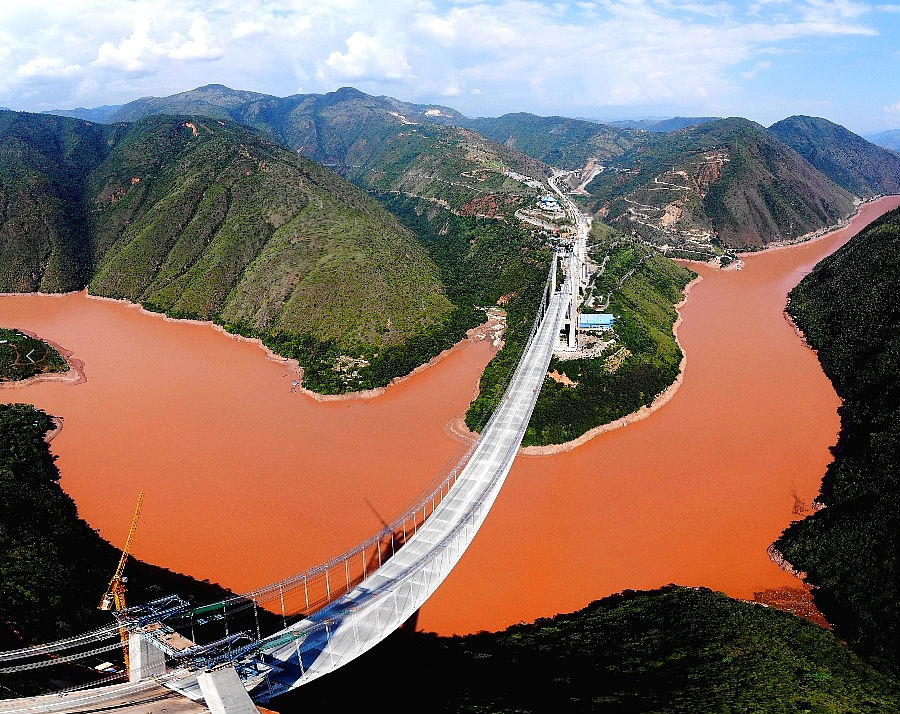 紅河全長1280公里,是一條跨越中國和越南的國際河流。由于流域多紅色沙頁巖地層,水呈紅色而得名。紅河特大橋即為跨越紅河南沙水庫而建,是我國首座跨越紅河的高速公路懸索特大橋。大橋由索塔、錨碇、懸索、吊索、橋面系組成,全長1366米,其中建水岸引橋長580米,元陽岸引橋長80米,主跨長700米。庫區水面距橋面高達184米,建水側主塔高181.29米,元陽側主塔高122.5米。