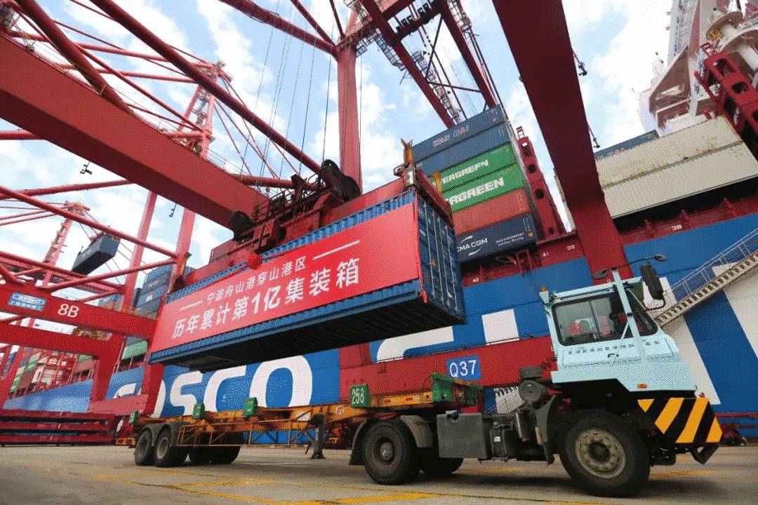 近日,隨著一個身披紅綢的集裝箱被吊裝到“中遠海運寶瓶座”輪,寧波舟山港穿山港區集裝箱碼頭歷年累計完成集裝箱吞吐量超1億標準箱。