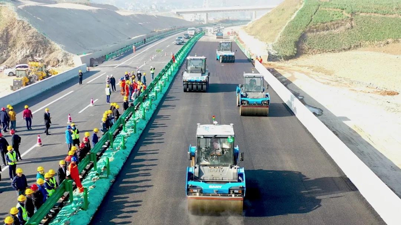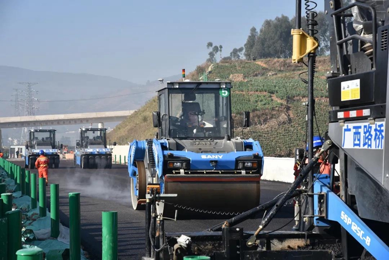 近日,在廣西北部灣投資集團有限公司直屬企業廣西路橋集團投資建設的云南省昌寧至保山高速公路項目(以下簡稱“昌保高速”)№4標清水溝K79+440—K79+940段施工現場,高等級攤鋪機、雙鋼輪壓路機、輪胎壓路機等機械群整裝待發。一場別開生面的高速公路瀝青路面無人駕駛攤鋪即將開始,這是北投集團首次在新建高速公路瀝青面層使用無人機群智能化施工。