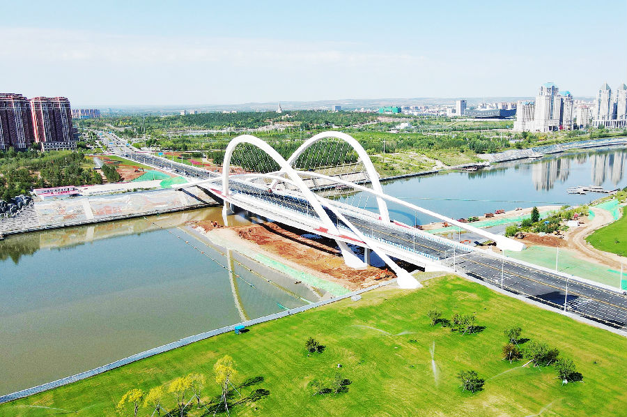 烏蘭木倫河3號橋全長348米,是中承復式鋼箱拱橋,半漂浮體系,設計通車時速為50公里/時,橋梁獨立的人行道和觀景平臺呈雙飛翼造型,橋型新穎美觀、技術難度大、科研價值高,開創了在高原地區建設結構復雜的大跨徑拱橋先例。