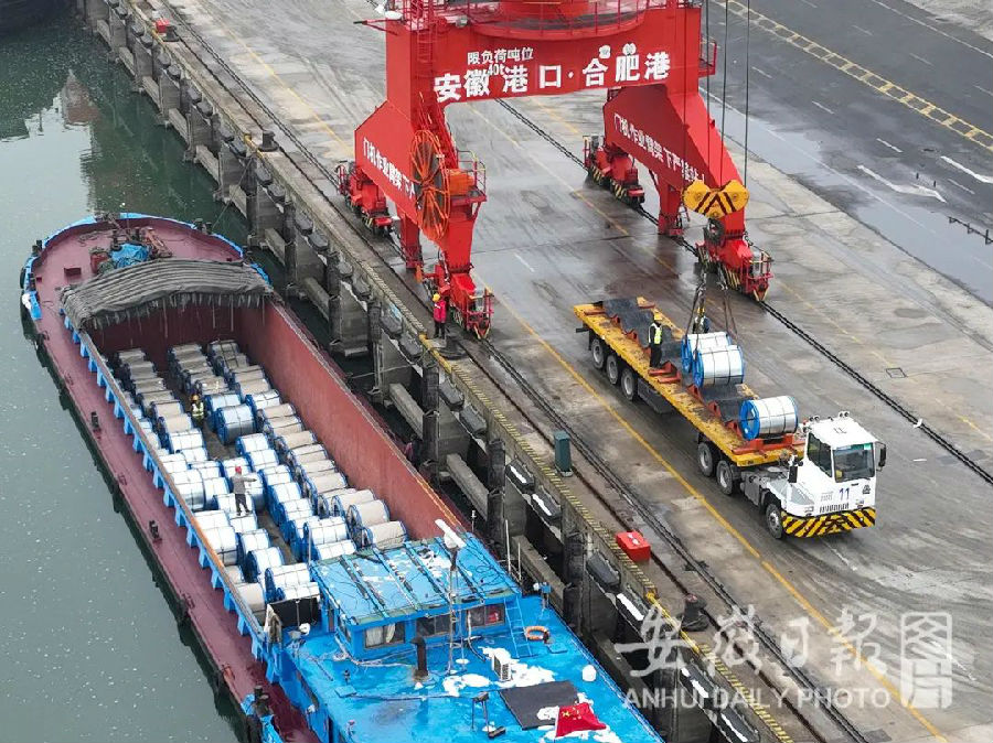 近日,在安徽省港航集團所屬的合肥港國際集裝箱碼頭外,新年貨運正忙。合肥港克服疫情和惡劣天氣等不利因素的影響,全力提高港口貨物接卸效率,確保港口新春穩健發展。