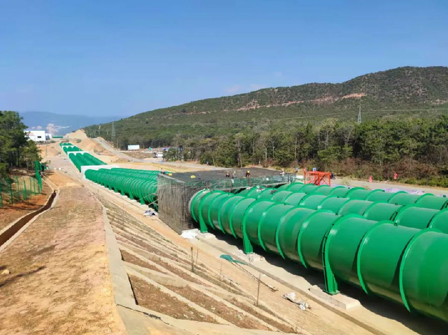 觀音山倒虹吸輸水工程是目前中國在建線路最長、施工規模最大的倒虹吸輸水工程。項目位于云南省楚雄州祿豐縣碧城鎮境內,管線全長9.777公里,西接龍潭隧洞,東連蔡家村隧洞,管線采用3根并排內直徑達4.2米的壓力鋼管組成輸水線。倒虹吸是相對于“∩”型的反向虹吸,即“U”形狀的倒虹吸;觀音山倒虹則是多個起伏狀的倒虹吸。其西接龍潭隧洞設計水位達1926.83米,東連蔡家村隧洞設計水位為1918.61米,利用東西兩端8米水位差形成流動勢能,推動管線輸送水流。