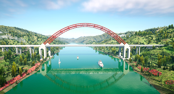 南寧-湛江高速公路南寧至博白那卜段№1標段三分部(簡稱“南湛高速1-3分部”)平陸運河舊州特大橋是南湛高速公路重點控制性工程之一,全長約525米,位于欽州市靈山縣舊州鎮境內,主橋跨越平陸運河,引橋跨越黎欽鐵路,主橋為跨徑260米的下承式鋼管混凝土系桿拱橋,主墩基礎為分離式沉井基礎,設計采用低位拼裝+中段拱肋門架法整體提升施工工藝,提升重量約1700噸,是目前國內最大整體提升跨徑和噸位的鋼管混凝土拱橋。