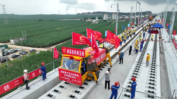 2023年8月18日上午,在新建南寧至玉林鐵路學沖村特大橋鋪軌施工現場,隨著首對500米長鋼軌平穩鋪設在無砟道床板上,標志著新建南寧至玉林鐵路項目正式進入全線鋪軌階段。